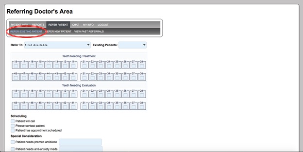 Click on “REFER EXISTING PATIENT”. You will be able to provide tooth number, reason for referral and upload any pertinent radiographs.